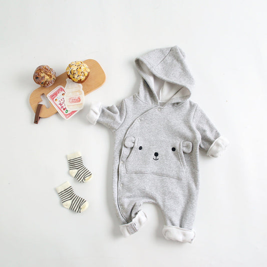 Baby Cartoon Embroidered Pattern Side Snap Button Fleece Rompers With Hat by MyKids-USA™