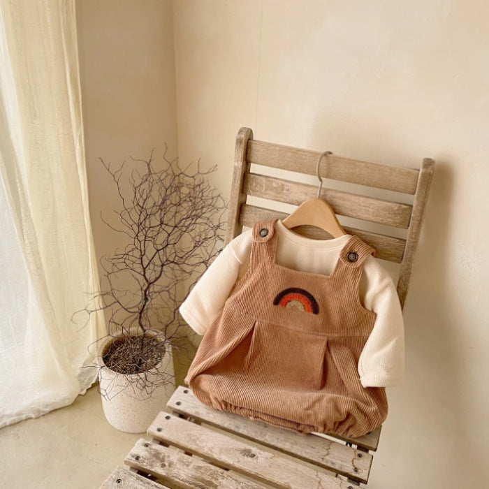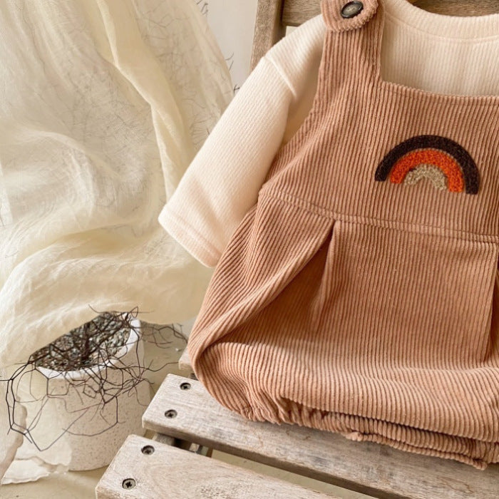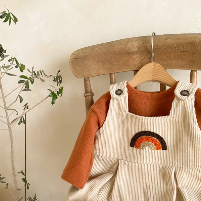 Dress your little one in cozy style with our Solid Color Shirt Combo featuring adorable corduroy fabric straps! Soft and comfortable, this Onesies Set is sure to be an adorable addition to your baby's wardrobe. Make memories that last with this charming outfit!